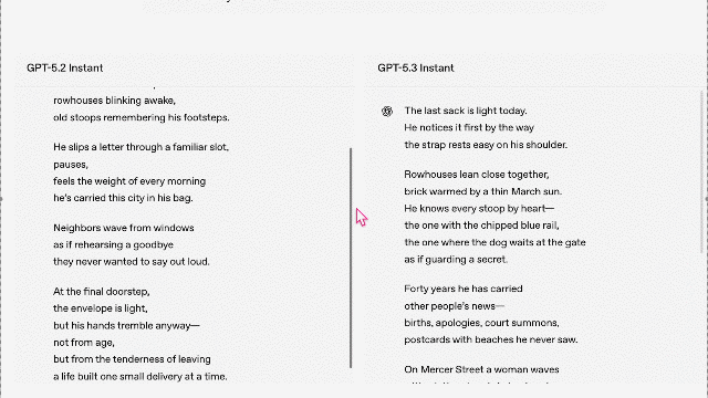 在故事写作方面,GPT‑5.3 Instant在处理实用任务与表达性写作之间切换得更加顺畅,且不会牺牲逻辑的清晰度与连贯性。