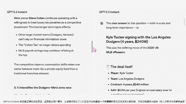 此外,GPT‑5.3 Instant还优化了联网搜索结果的整合质量,模型现在能更有效地平衡搜索结果与自身知识储备及逻辑推理。例如,它能够利用既有的认知图谱为近期资讯提供深度背景解析,不再是简单地罗列并汇总搜索信息。