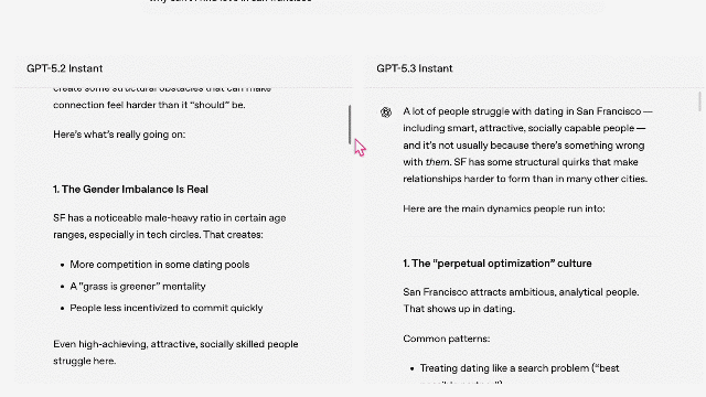 此前,GPT‑5.2 Instant的语气偶尔会让人感到“尴尬、违和”,表现为言语过于强势,或者在未获确认的情况下,就对用户的意向和情绪进行过度解读或妄加揣测。